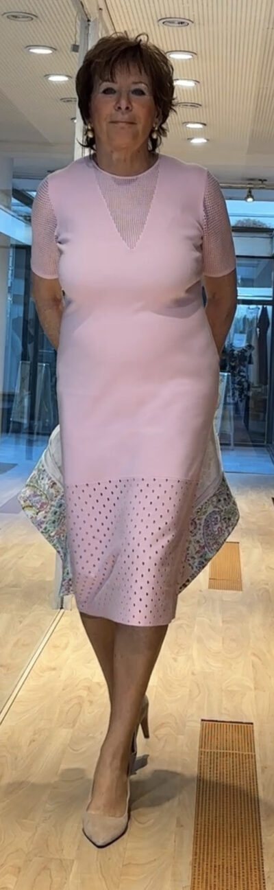 Hier sieht Frau das Strickkleid in Rosé ohne Blazer.