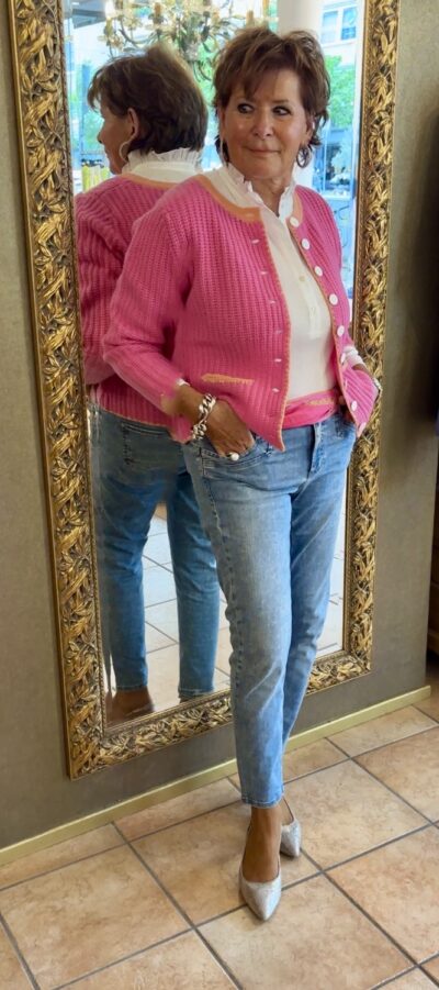 Die Kaschmirjacke in der Farbe Pink, mit Orange paspeliert.