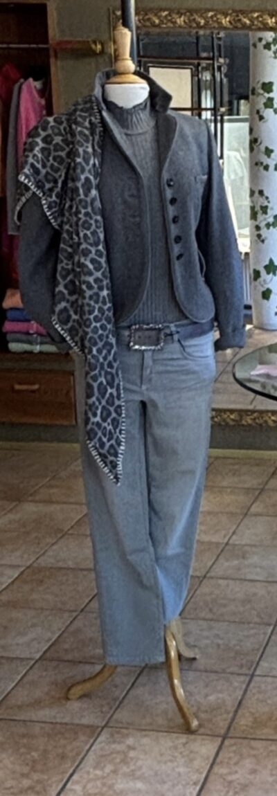…in dezenten Grautönen, mit einem raffinierten Leo–Schal als Hingucker.