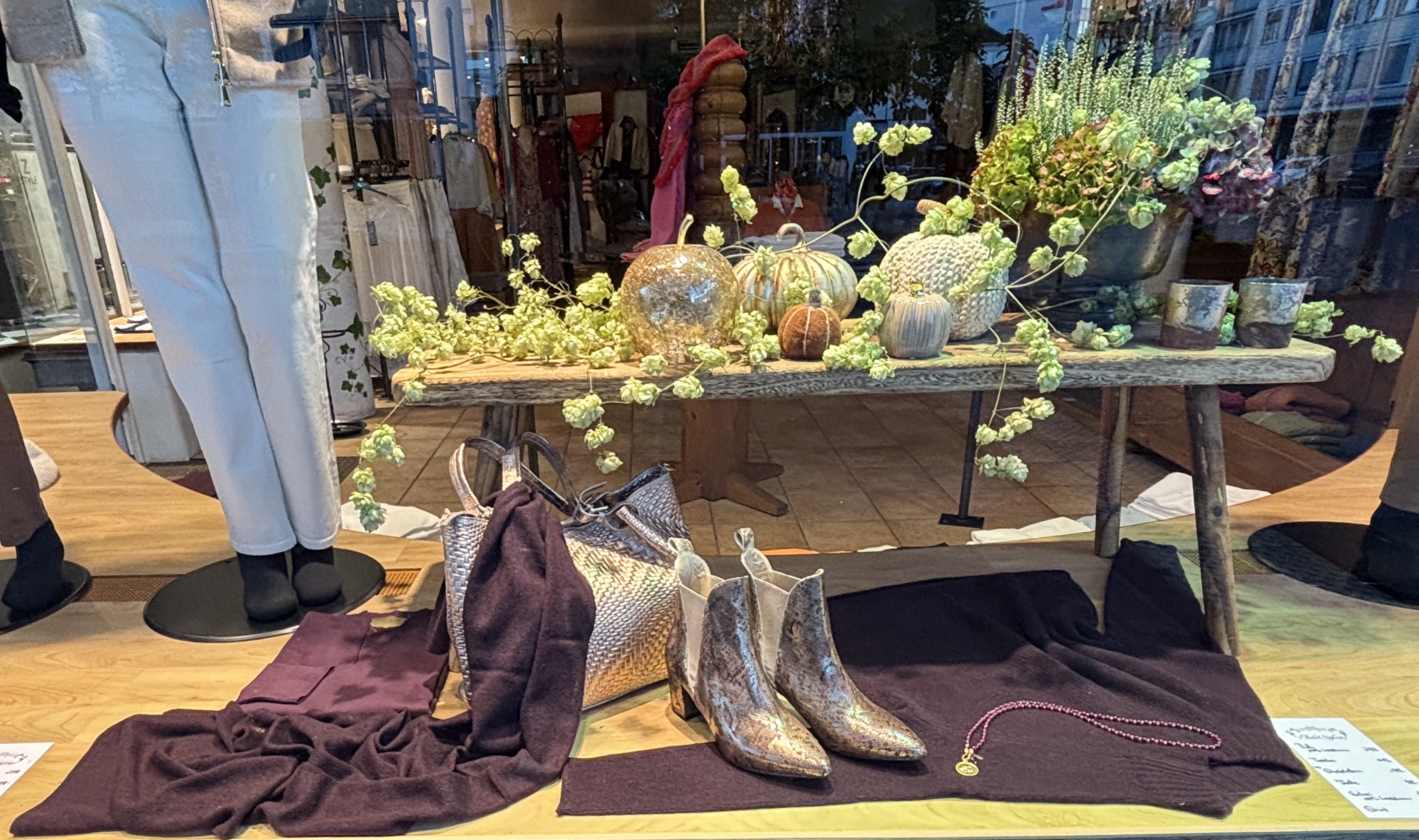 Edler Kaschmirpulli, Kaschmirschal, Shirt und Rolli. Perfekt ergänzt durch Stiefeletten in Schlangenoptik, eine Tasche in Rotgold sowie eine Kette in in harmonierenden Brombeertönen.