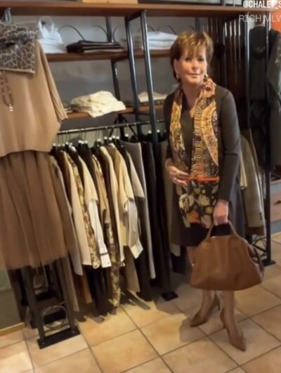 Abgerundet wird der Look durch einen Schal in warmen Herbsttönen, sowie Accessoires in Cognac.