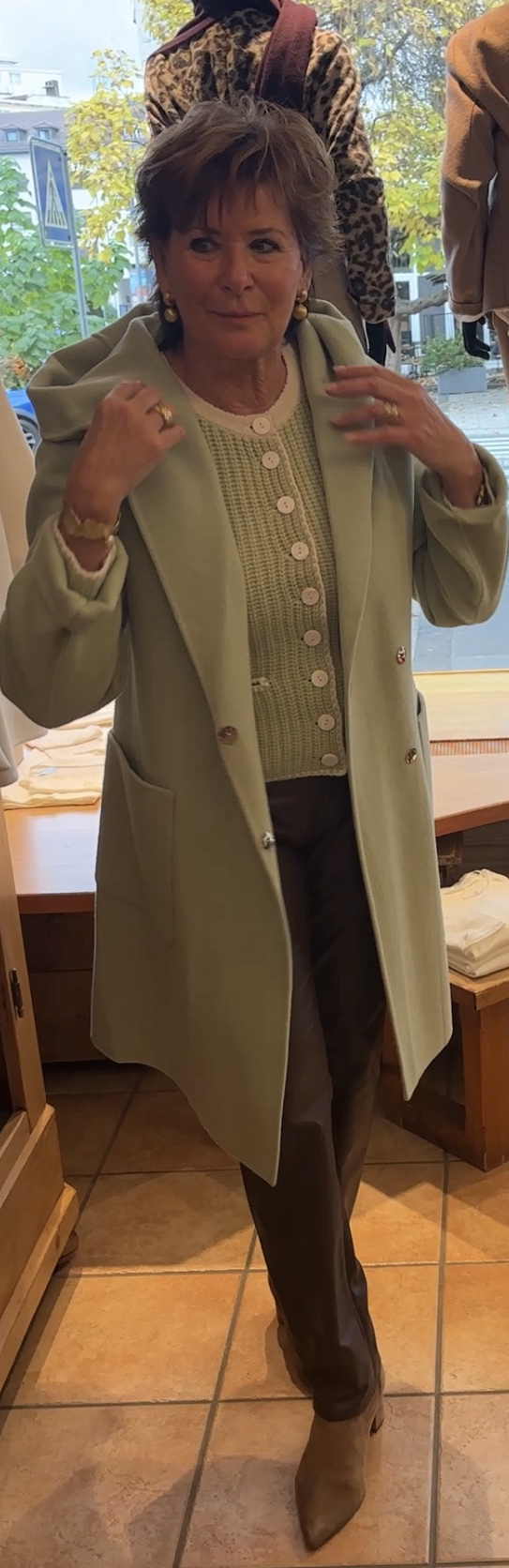 Der feine Mintgrüne Mantel passt perfekt zur Kaschmirjacke.