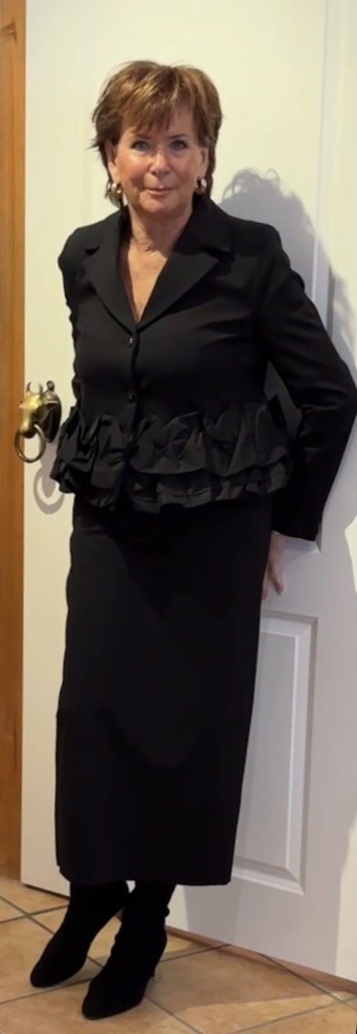 Das kurze Bolero–Jacke mit aufwendig gearbeiteten Rüschen am Saum trifft auf einen klassisch schmal geschnittenen Rock mit dezentem Rückenschlitz.