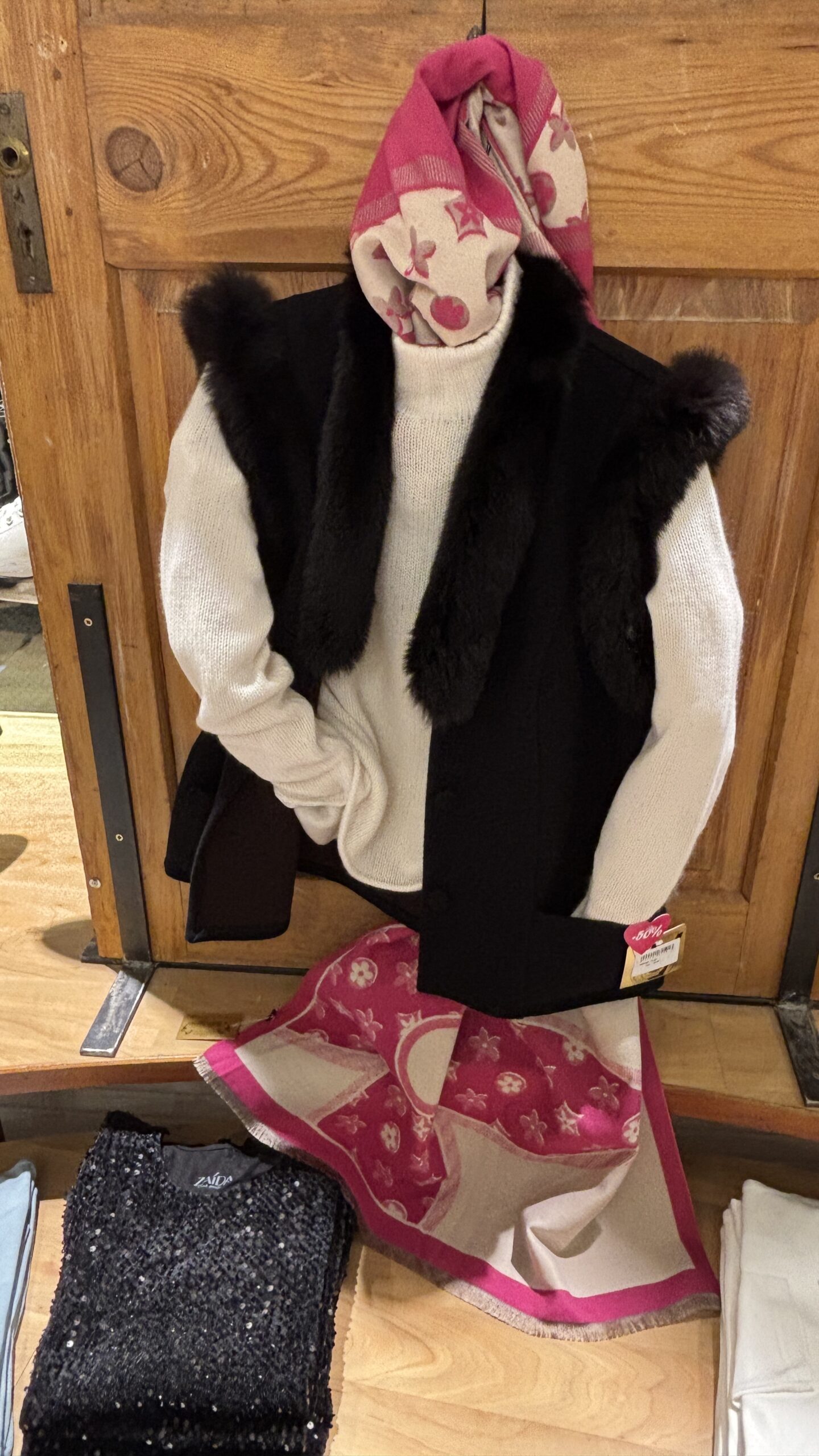 Passend über dem Kaschmirpulli eine schwarze Weste die mit Pelz verziert ist. Kuschelig und warm geht es in die Winterzeit.