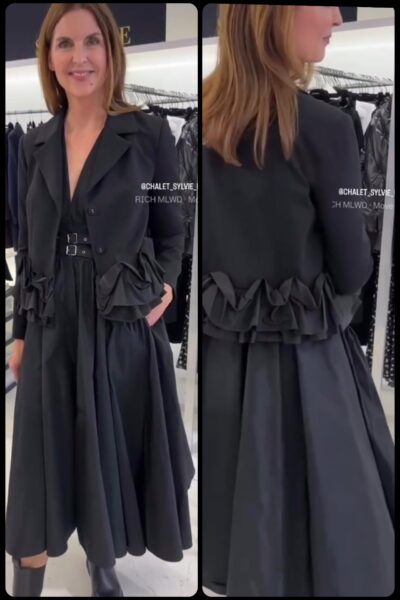Schwarzes Kleid mit schwingendem Rock und taillienbetonenden Schnallen, dazu eine kurze Jacke mit Revers und unten am Saum Volants – luxuriös und stilvoll.