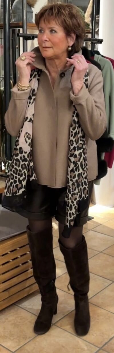 Kurze Ledershorts trifft auf camelfarbene Jacke und Leoschal – lässig und sportlich zugleich. Jacke 498€ –30%
