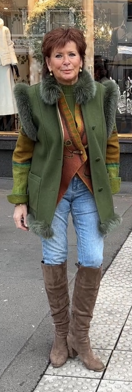 Handgefilzte Walkjacke in warmen Herbsttönen, dazu eine Wendeweste mit Pelzbesatz.