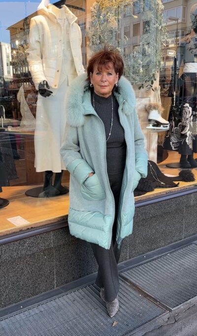 Der mintfarbene Mantel mit Daunenfüllung und soften Strickakzenten, ist lässig geschnitten.