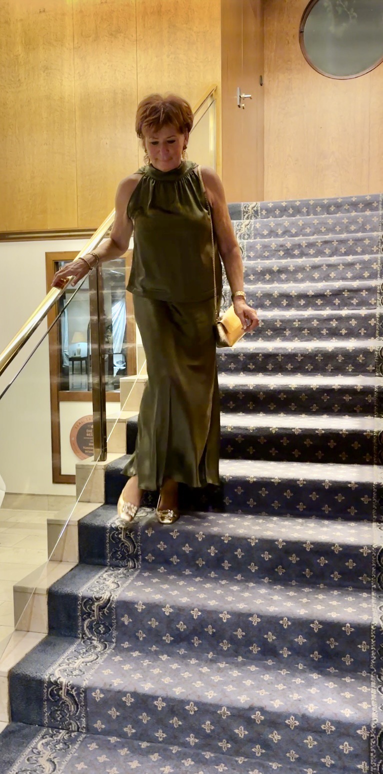 Das zweiteilige Seiden–Stretch–Kleid in Oliv.
